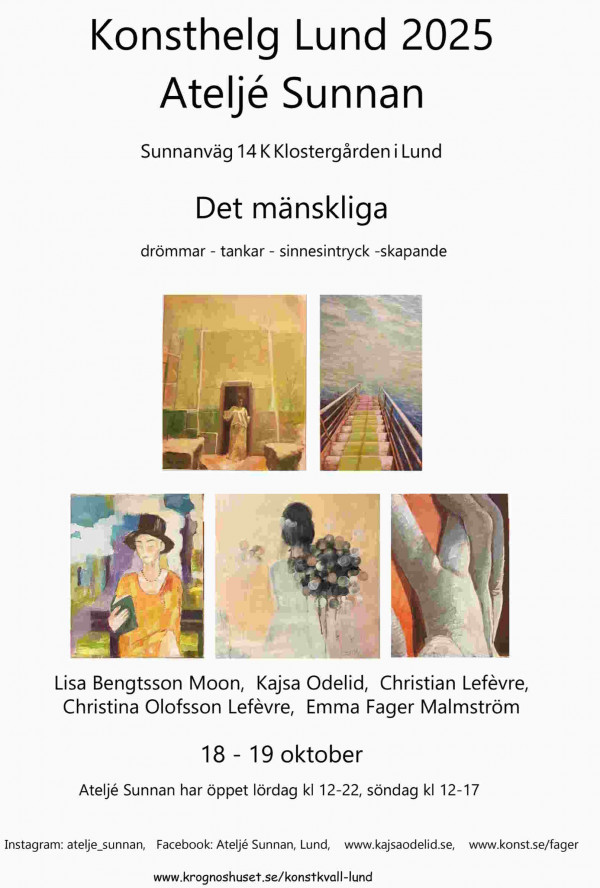 Under KONSTKVÄLL LUND 2025 den 18 -19 oktober visar Ateljé Sunnan utställningen "Det mänskliga". Ateljéns fem konstnärer gör personliga tolkningar av det mänskliga i målningar i olja och akryl.